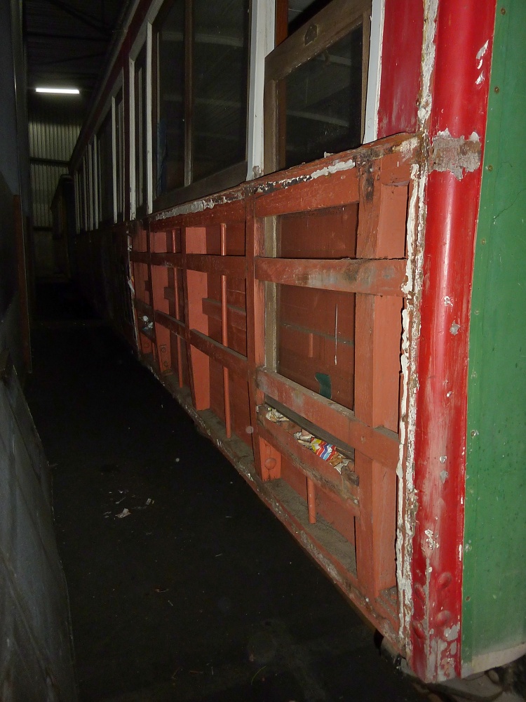 Nach dem Entfernen einer MDF-Platte am Oberlicht des Wagens: Sichtbar wird die erhalten gebliebene Wandfüllung zwischen Stirnwand und erstem Oberlichtfenster.