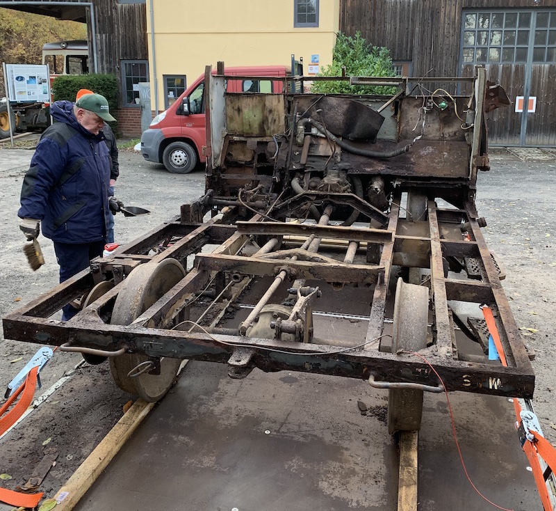 Am Donnerstag haben wir in Brohl die Draisine Klv 09-0002 abgeholt. Der marode Aufbau ist beim Transport nicht zerbröselt, sicherheitshalber war alles neben Spanngurten noch mit einem Netz gesichert. Heute geht es an den Abbau der Haube und Türen; der Rest des Aufbaus wird vom Fahrgestell abgehoben. Mal schauen, wie weit wir heute kommen....