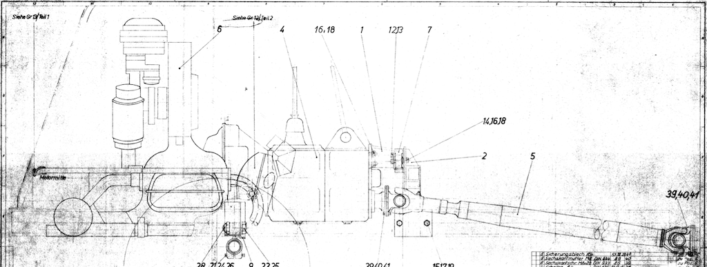 Der Antriebstrang in einer FKF-Fabrikzeichnung. Neben dem VW-Industriemotor hat FKF auch für die Getriebehalterungen auf Teile aus dem VW Programm zurückgegriffen. Die Gummi-Metall-Elemente können deshalb als Neuteil bei Ersatzteilhändlern für VW Käfer für unter 10 € gekauft werden. Eine aufwändige Einzelanfertigung ist deshalb nicht erforderlich.