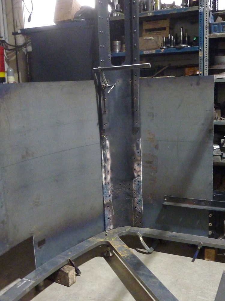 Das hintere Rückwand- /Seitenwandblech der RUR mit deutlichen Spuren der Richtarbeiten, die an den senkrechten Eckstützen noch erforderlich waren.